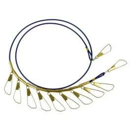 10 brass sleeve and stainless steel hook assemblies. Allows fish to move around and live longer. Durable, vinyl coated cable.